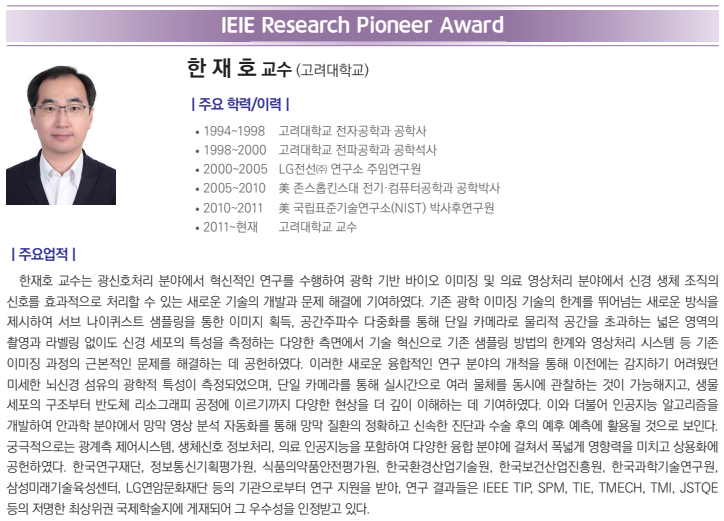 Professor Jaeho Han of Korea University Graduate School Department of Brain & Cognitive Engineering has been selected as the recipient of the 2024 IEIE (The Institute of Electronics and Information Engineers) Research Pioneer Award, sponsored by the Haedong Science Foundation. This award recognizes his groundbreaking research contributions to imaging and its applications, which have significantly advanced Korea’s ICT academia and technology.
